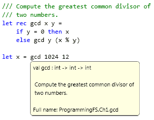 For F# applications written in Visual Studio, there is a third type of comments: an XML documentation comment. If a comment starting with three slashes (///) is placed above an identifier, Visual Studio will display the comment’s text when you hover over it: