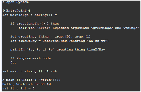 Here’s a slightly more complex Hello, World to show off the syntax of F#: