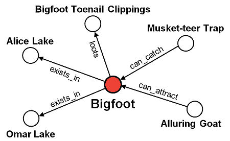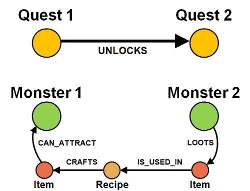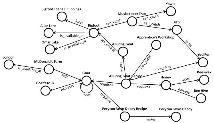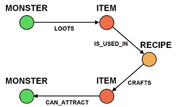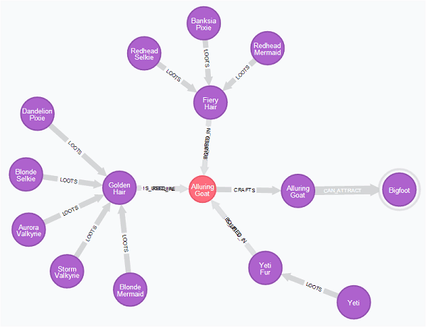 Suppose we are on a quest to catch Bigfoot, we can use this query to identify the monsters we have to catch first in order to get the ingredients to make the bait for Bigfoot. The query yields the following result where the purple nodes are monsters and the red node in the middle is the recipe for crafting the Alluring Goat.
