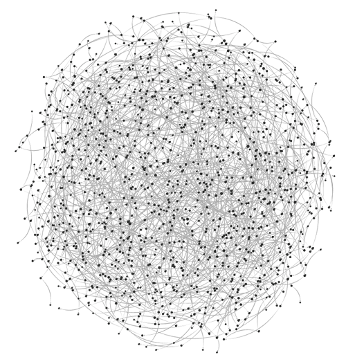 Visualizing the 8,000+ nodes and around 40,000+ edges in Gephi, where the colour and size of the nodes represent the number of connections they have, this is what the internal data model for Here Be Monsters look like: