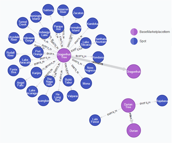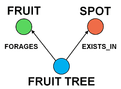 (fruit)<-[:FORAGES]-(tree)-[:EXISTS_IN]->(spot)