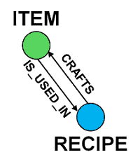 Running this query yields the following result, where the purple nodes are items and red nodes are recipes.
