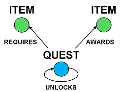 On the other hand, completing a quest can sometimes award you items as well. If the quest is part of a quest line then you will also unlock follow-up quests too, so there is a self-recursive relationship there.
