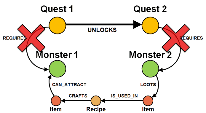 For instance, if completing Quest 1 unlocks Quest 2, and catching Monster 2 gives you the loot you need to make the bait for Monster 1: