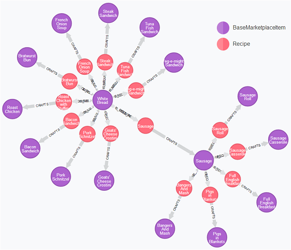 From this graph we can see that White Bread is used directly in 10 recipes, and then indirectly (virtue of being an ingredient for making Sausage) in a further 5. If we were to change the price of White Bread, all 15 of these items will need to have their prices adjusted based on the number of White Bread required to make them.