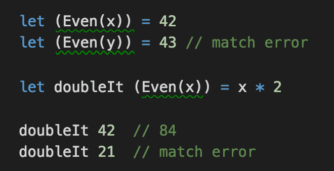 Here, the Int pattern returns an Int, and instead of binding it to a name we can apply another pattern inline to check if the value is even.