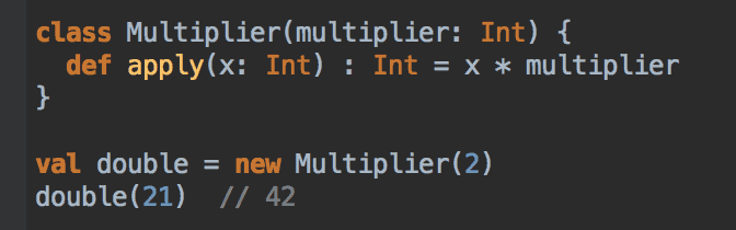 You can also define an apply function on a class as well as an object, and it works the same way. For instance…