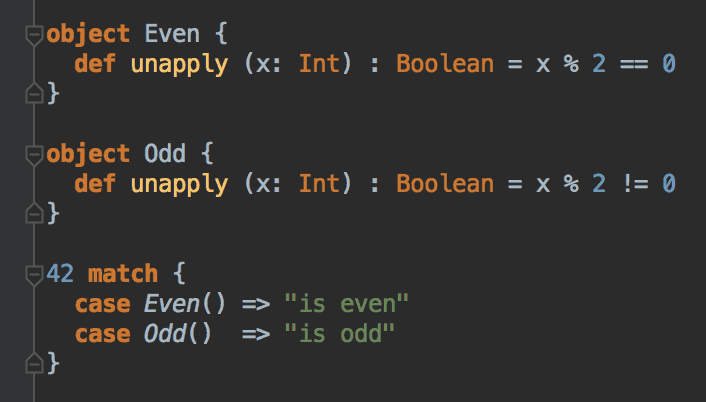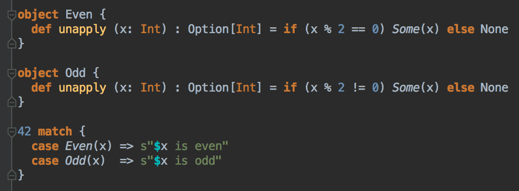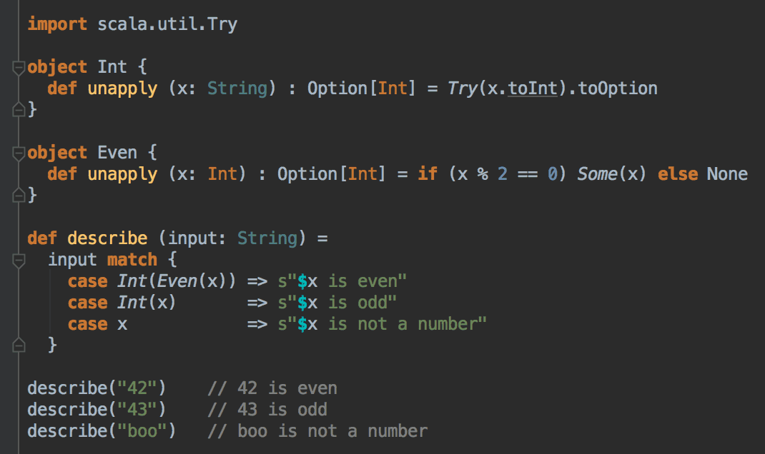 - multiple extractors working together (maybe even loosely grouped together via a common trait) can mimic a multi-case pattern, although it’s up to you to ensure the extractors don’t overlap on input values