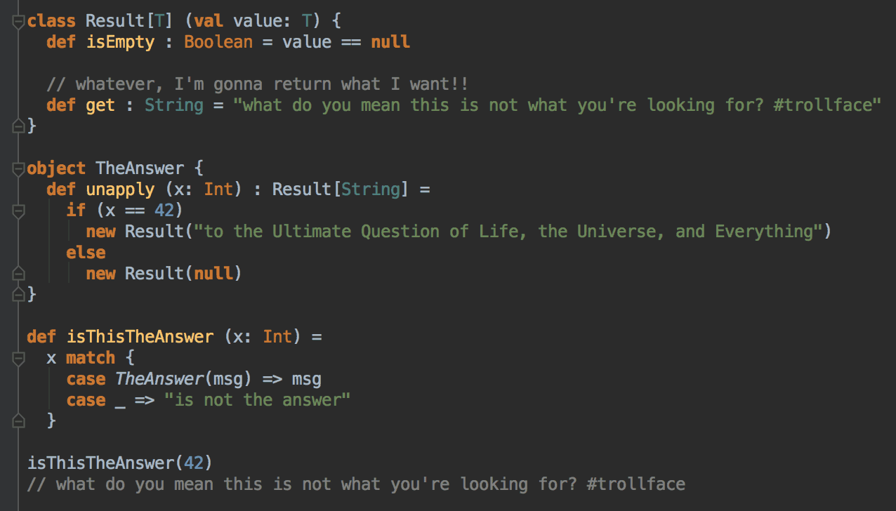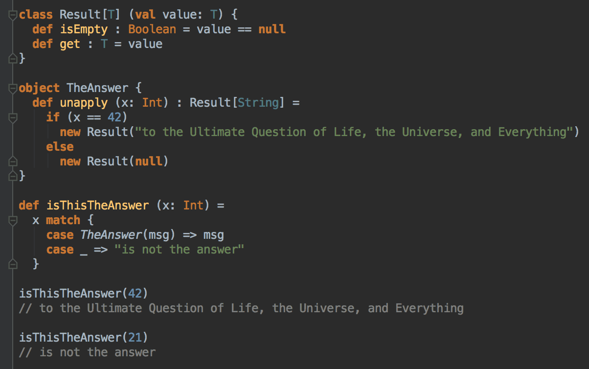side note: point 2 is interesting. Looking at all the examples on the Internet one might assume the unapply function must return an Option[T], but turns out it’s OK to return any type so long it has the necessary members!