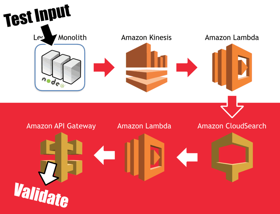 The acceptance test first sets up the test condition – a new user joins – by interacting with the system from the outside and calling the legacy API like the client app would. From here, a new-user-joined event will be fired into Kinesis; a Lambda function would process the event and add a new document in the User index in CloudSearch; the test would validate that the user is searchable via the Search API.