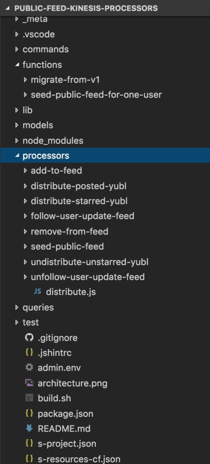 The background processing (initially only Kinesis but later expanded to include SNS as well, though the repo wasn’t renamed) functions have many shared code, such as the distribute module you see below, as well as a number of modules in the lib folder.