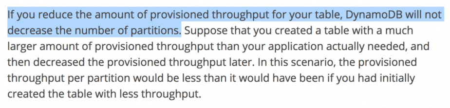 However, they often forget to mention that the DynamoDB will not decrease the no. of partitions when you reduce your throughput units. It’s a crucial detail that is badly under-represented in a lengthy Best Practice guide.