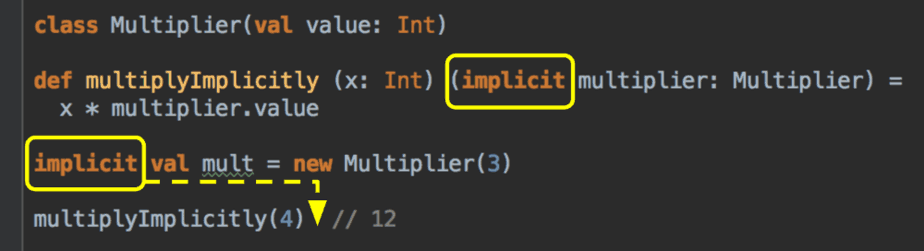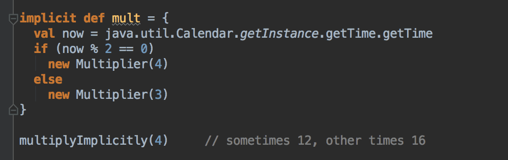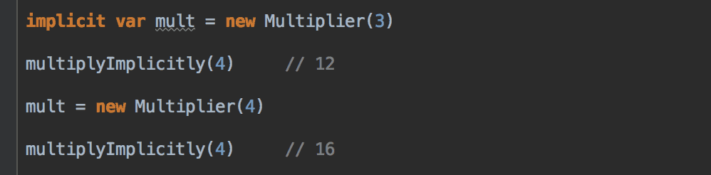 Unsurprisingly, implicit var also works, and given the mutable nature of var it means multiplyImplicitly can yield different value depending on when it’s called.