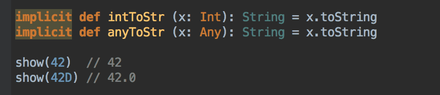 Just before the Scala compiler throws a typemismatch exception it’ll look for suitable implicit conversion in scope and apply it. Which means, our implicit conversions can be useful outside of the show function too.