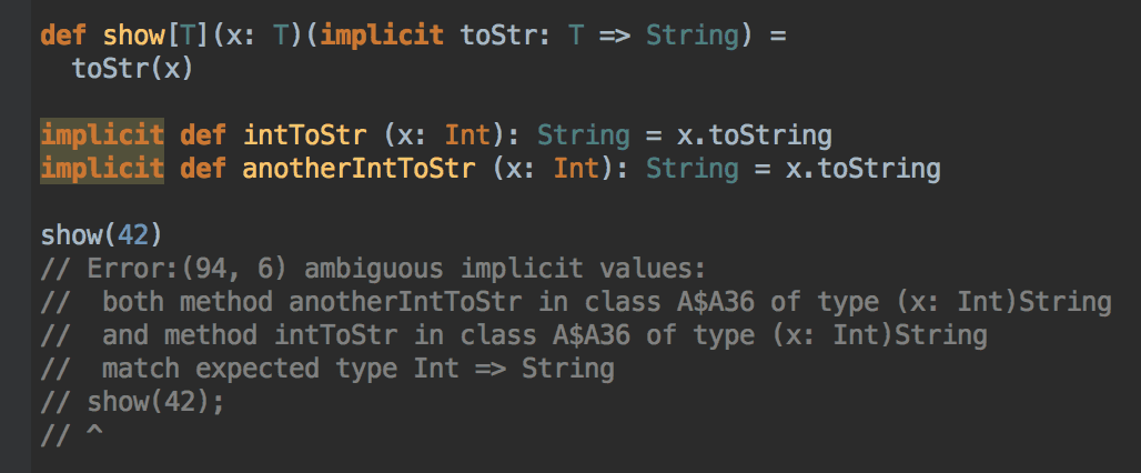What if there’s a more generic implicit conversion with the signature Any -> String, would the compiler complain about ambiguous implicit values or is it smart enough to use intToStr for Int?