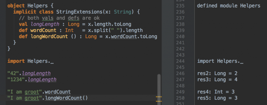 Finally, we have implicit classes which allows you to implement .Net style extension methods.