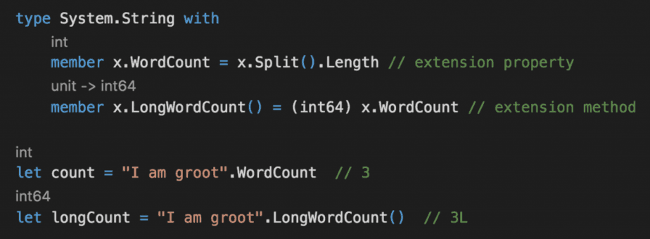 Note that in addition to extension methods, you can also create extension values and properties with implicit class. Which, as we mentioned at the start of the post, is something that you can also do with F#’s type extensions mechanism.