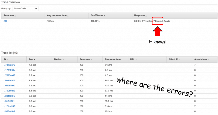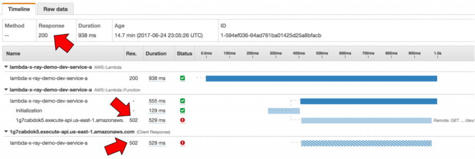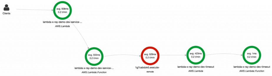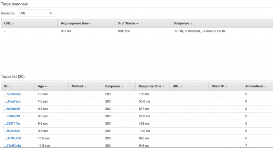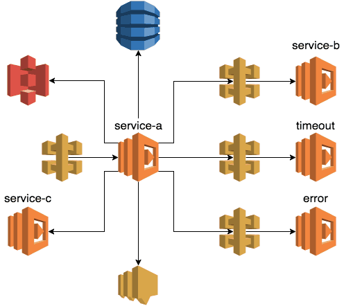 // ... omitted for brevity module.exports.handler = co.wrap(function* (event, context, callback) { console.log(JSON.stringify(event)); console.log(JSON.stringify(context)); global.hostname = event.headers.Host; global.accountId = event.requestContext.accountId; global.requestId = event.requestContext.requestId; let segment = AWSXRay.getSegment(); console.log(JSON.stringify(segment)); let n = Math.random() * 3; segment.addMetadata('random', `${n}`); // this doesn't work segment.addAnnotation('path', event.path); // this doesn't work if (n <= 1) { yield publishSNS(segment); yield accessS3(segment); yield accessDynamoDB(segment); yield invokeLambda(segment); let message = yield callServiceB(segment, n); const response = { statusCode: 200, body: JSON.stringify({ message: `service-b says ${message}` }), }; callback(null, response); } else if (n <= 2) { console.log("service-a is going to call the timeout endpoint"); yield utils.request('GET', hostname, '/dev/demo/timeout'); throw new Error("timed out"); } else { console.log("service-a is going to call the error endpoint"); yield utils.request('GET', hostname, '/dev/demo/error'); throw new Error("boom"); } });