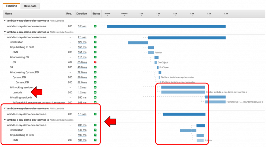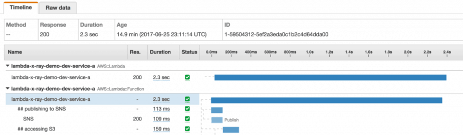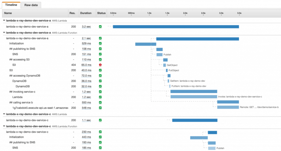 This is a trace of the service-a function, which includes the time it takes for Lambda to initialise the function, and the various downstream systems it talked to, all nested by under custom subsegments. It even includes the trace of the service-c function (and the time it spent publishing to SNS) which was invoked using the Lambda API.
