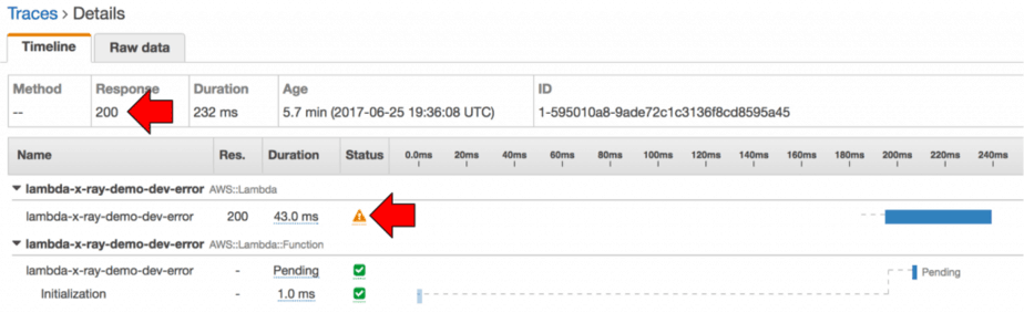 function is invoked through its API Gateway endpoint and errors, the corresponding trace still reports a 200 response code.