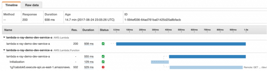 ’s trace follows through the HTTP request to API Gateway and includes the invocation of the timeout