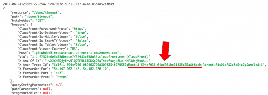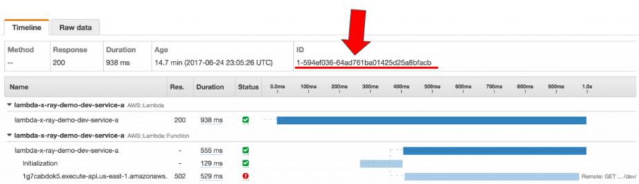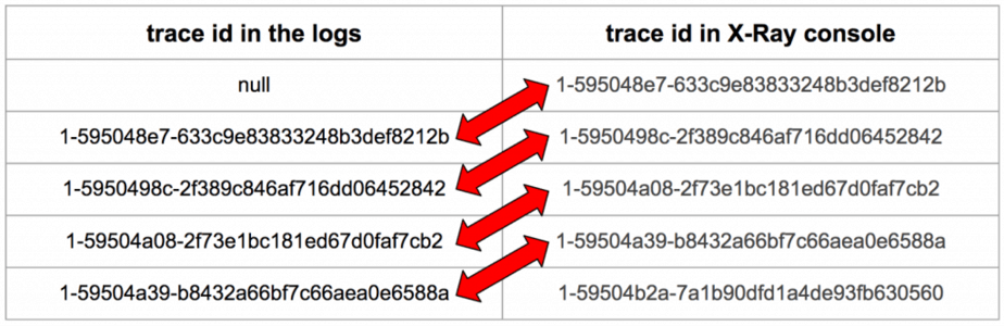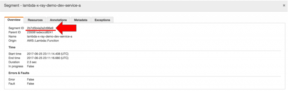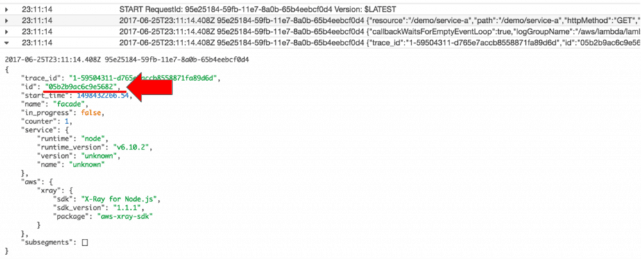 Looking at the logs, I found something interesting: the segment ID for the root segment doesn’t match the segment ID in the X-Ray trace.