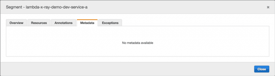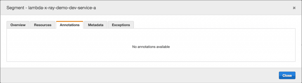 module.exports.handler = (event, context, callback) => { ... let segment = AWSXRay.getSegment(); let n = Math.random() * 3; segment.addMetadata('random', `${n}`); // this doesn't work segment.addAnnotation('path', event.path); // this doesn't work ... }