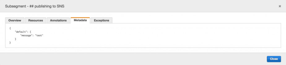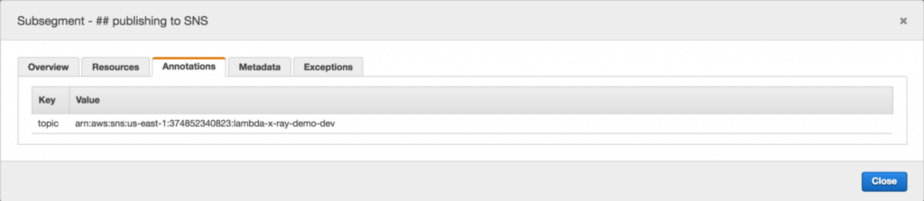 let publishSNS = segment => { return new Promise((resolve, reject) => { console.log('publishing to SNS topic'); let f = co.wrap(function* (subsegment) { ... subsegment.addAnnotation('topic', topicArn); subsegment.addMetadata('message', 'test'); let req = { Message: message, TopicArn: topicArn }; yield sns.publishAsync(req); subsegment.close(); resolve(); }); AWSXRay.captureAsyncFunc("## publishing to SNS", f, segment); }); };