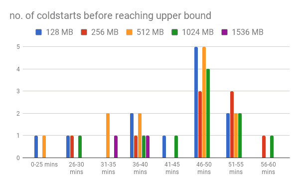 - the function with 1536 MB memory sees significantly fewer no. of cold starts prior to hitting the upper bound (worth noting that it also has a lower upper bound (48 mins) than other functions in this test