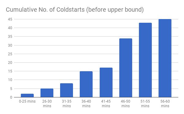 - over 60% of coldstarts (prior to hitting the upper bound) happened after 45 mins of inactivity