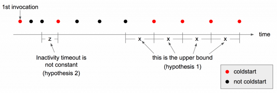 and report when it has experienced a coldstart. We also need a mechanism to progressively increase the interval between invocations until we arrive at an interval where each invocation is guaranteed to be a coldstart?—?the upper bound. We will determine the upper bound when we see 10 consecutive coldstarts when invoked X minutes apart.