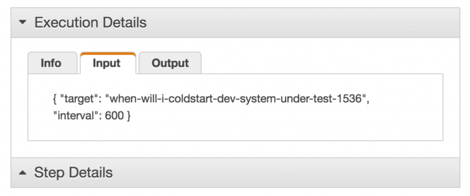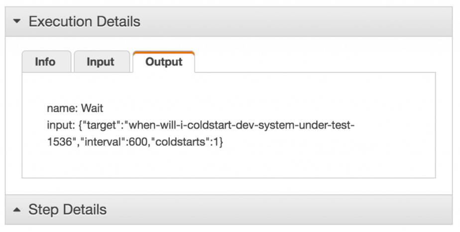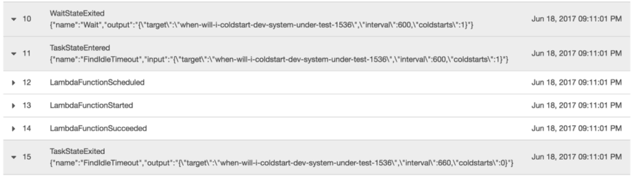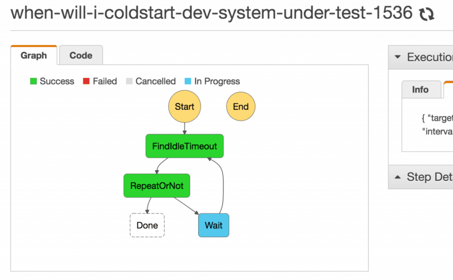 { "Comment": "How long AWS Lambda keeps idle functions around?", "StartAt": "FindIdleTimeout", "States": { "FindIdleTimeout": { "Type": "Task", "Resource": "arn:aws:lambda:us-east-1:{account_id}:function:when-will-i-coldstart-dev-find-idle-timeout", "Next": "RepeatOrNot" }, "RepeatOrNot": { "Type" : "Choice", "Choices": [ { "Variable": "$.coldstarts", "NumericEquals": 10, "Next": "Done" } ], "Default": "Wait" }, "Wait": { "Type": "Wait", "SecondsPath": "$.interval", "Next": "FindIdleTimeout" }, "Done": { "Type" : "Succeed" } } }