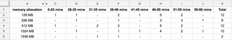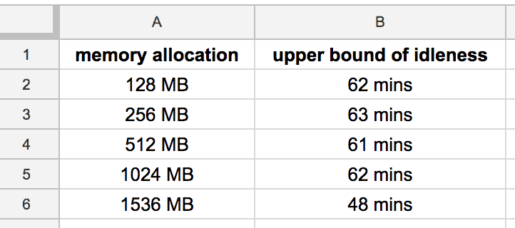From the data, it’s clear that AWS Lambda shuts down idle functions around the hour mark. It’s also interesting to note that the function with 1536 MB memory is terminate over 10 mins earlier, this supports hypothesis 3.