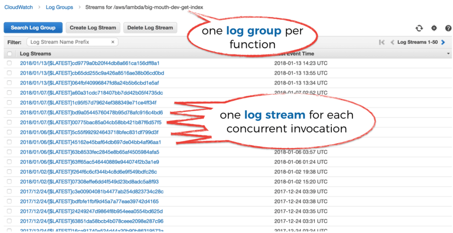 All the log messages (technically they’re referred to as events) for a given function would appear in CloudWatch Logs under a single Log Group.