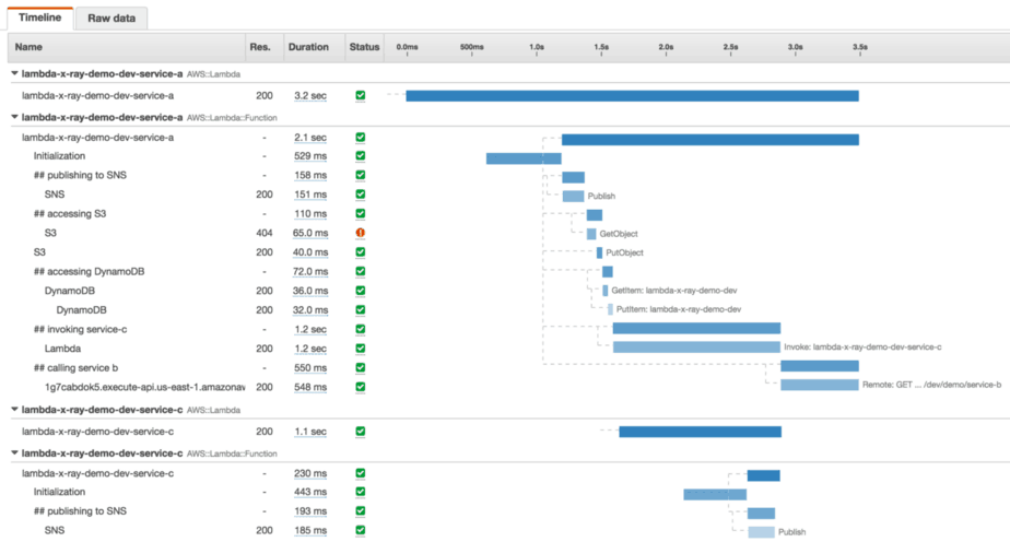 X-Ray gives you a lot of insight into the runtime performance of a function. However, its focus is narrowly on one function, the distributed aspect is severely undercooked. As it stands, X-Ray currently doesn’t trace over API Gateway, or asynchronous invocations such as SNS or Kinesis.