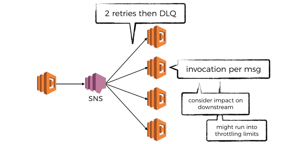 Another thing to consider is the degree of parallelism this setup offers. For each message SNS will create a new invocation of your function. So if you publish 100 messages to SNS then you can have 100 concurrent executions of the subscribed Lambda function.