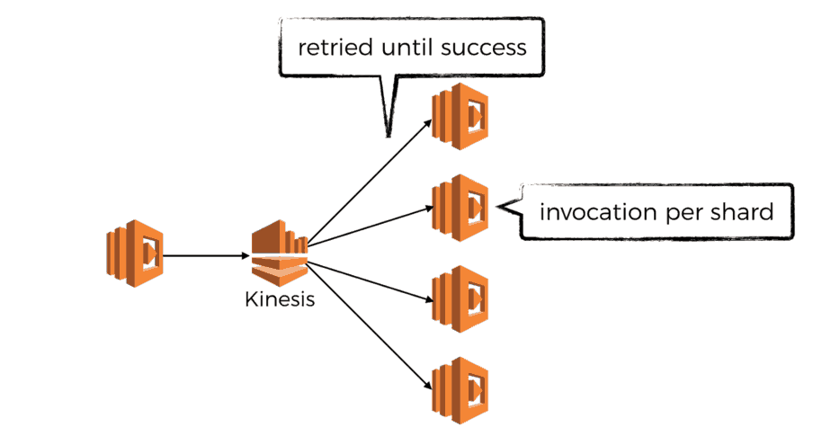 - the degree of parallelism is determined by the no. of shards in the stream as there is one dedicated invocation per shard