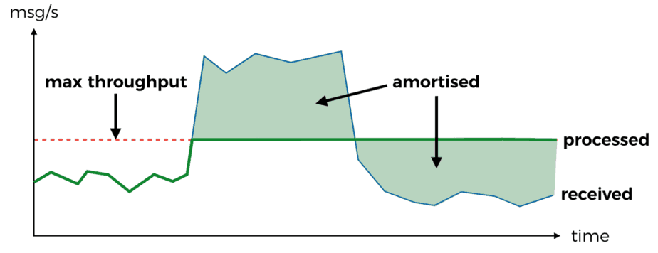 - degree of parallelism is constrained by no. of shards, which can be used to amortise bursts in message rate