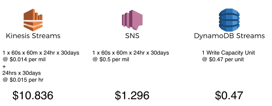 These projections should not be taken at face value. For starters, the assumptions about a perfectly consistent throughput and message size is unrealistic, and you’ll need some headroom with Kinesis & DynamoDB Streams even if you’re not hitting the throttling limits.