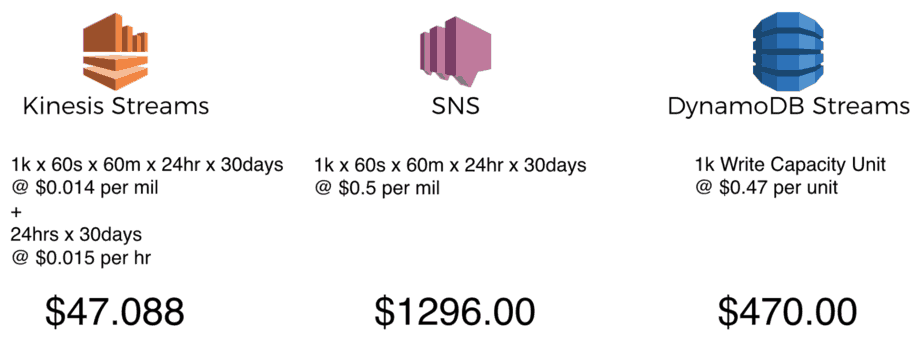 - whilst there’s a baseline cost for using Kinesis Streams, the cost grows much slower with scale compared to SNS and DynamoDB Streams, thanks to the significantly lower cost per million requests