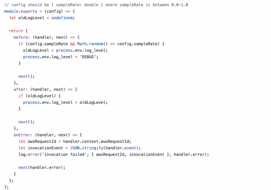 Using middy, I can create a middleware to dynamically update the log level to DEBUG. It does this for a configurable percentage of invocations. At the end of the invocation the middleware would restore the previous log level.