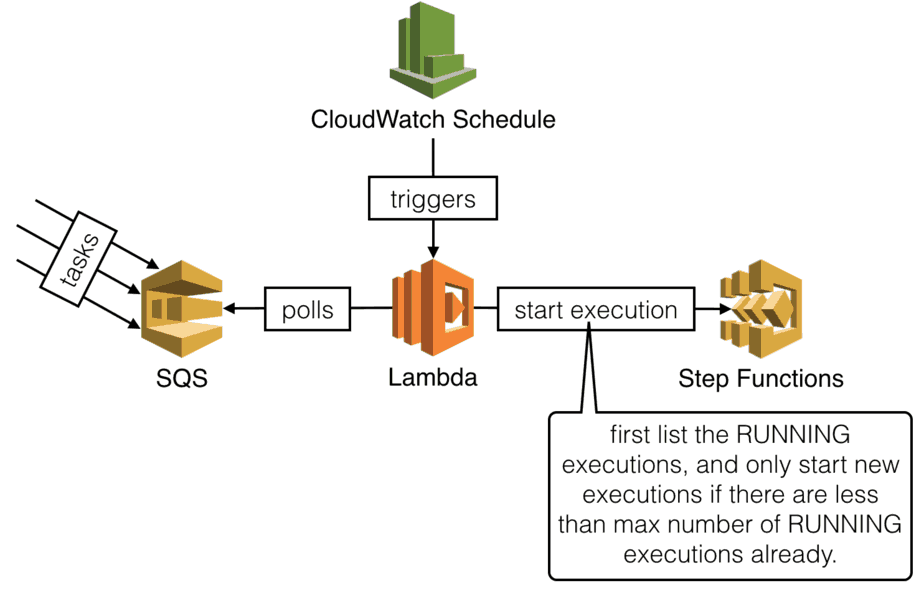 We’re not using the new SQS trigger for Lambda here because the purpose is to slow down the creation of new executions. Whereas the SQS trigger would push tasks to our Lambda function eagerly.