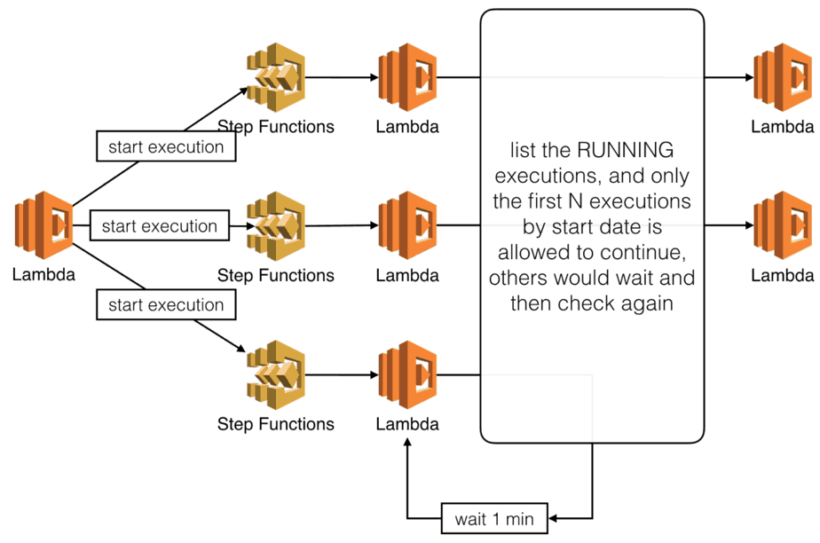You can control the MAX number of concurrent executions by introducing a SQS queue. A CloudWatch schedule will trigger a Lambda function to…