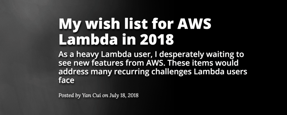 My wish list for AWS Lambda in 2018. Hot on the heels of the SQS announcement, I came up with a list of features I would love to see from AWS Lambda. Amongst these include: