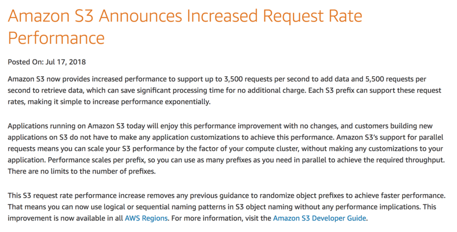 S3 announces increased request rate performance. This is huge, and removes the performance bottleneck with S3 that required us to use randomized keys in the past.