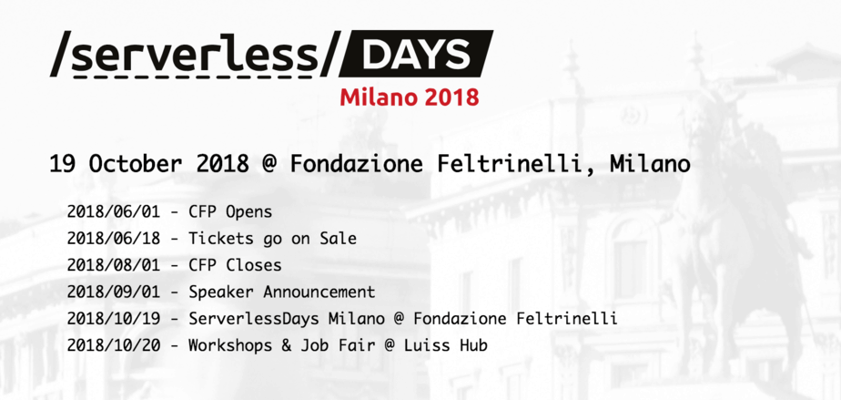 I’m honoured to be invited as a keynote speaker at ServerlessDays Milan, which is happening on the 19th October. The call for paper is still open so don’t miss your chance to speak at another exciting serverless event in Europe! The other keynote speaker is the one and only Gojko Adzic, creator of claudia.js and author of one of my favourite books on testing – Specification by Example.