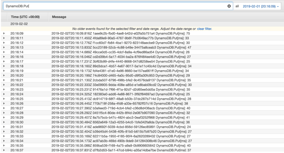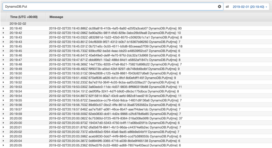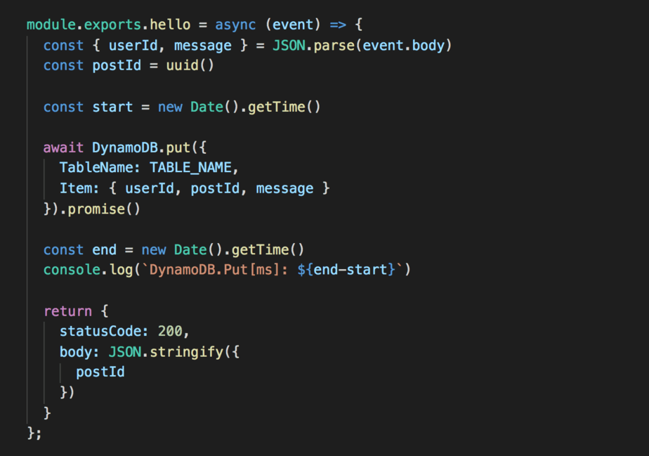 To test the effect of enabling HTTP keep-alive, I setup a simple Lambda function behind API Gateway. Essentially this function puts an item into a DynamoDB Table, and that’s it.