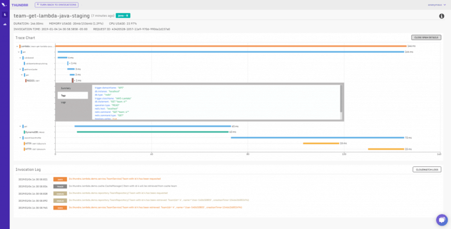 Built for effortless implementation and full observability, Thundra provides deep insight into your entire serverless environment no matter if you are just starting to write code or maintaining large scale serverless applications. Thundra collects and correlates all your metrics, logs, and traces, allowing you to quickly identify problematic invocations and also analyzes external services associated with that function. With Thundra’s zero overhead and automated instrumentation capabilities, your developers are free to write code without worrying about bulking up their Lambdas or wasting time on chasing black box problems.