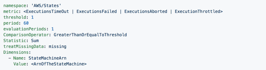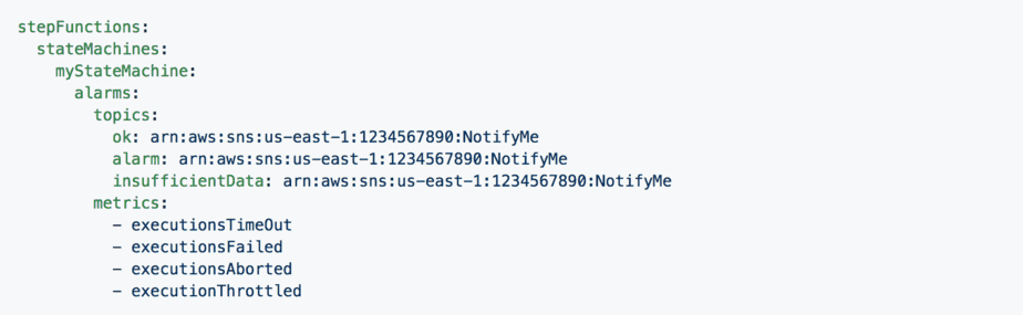 The syntax for declaring CloudWatch Alarms is straight forward, and supports the four CloudWatch metrics that Step Functions publishes for your state machines.