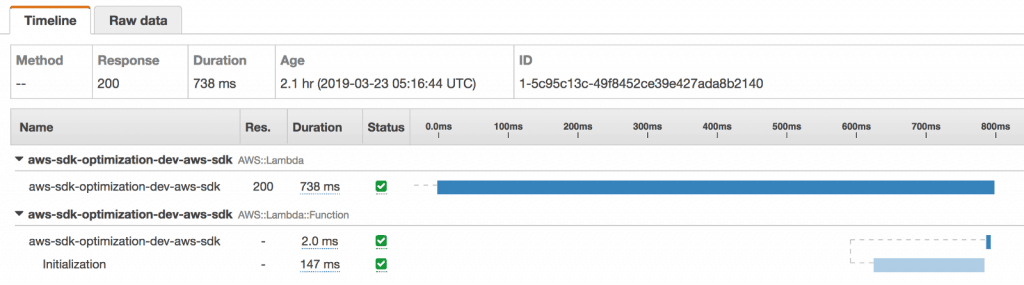 Each of these functions are traced by X-Ray. Sample rate set to 100% so we don’t miss anything. We are only interested in the duration of the Initialization segment as it corresponds to the time for initializing these dependencies.